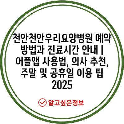 천안천안우리요양병원 예약 방법과 진료시간 공지 | 어플앱 사용법, 의사 추천, 주말 및 공휴일 이용 팁 2025 에 대해 자주 묻는 질문 TOP 5