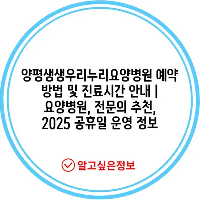 양평생생우리누리요양병원 예약 방법 및 진료시간 공지 | 요양병원, 전연락 추천, 2025 공휴일 운영 정보 에 대해 자주 묻는 질문 TOP 5