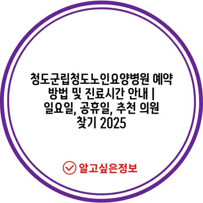 청도군립청도노인요양병원 예약 방법 및 진료시간 공지 | 일요일, 공휴일, 추천 의원 찾기 2025 에 대해 자주 묻는 질문 TOP 5